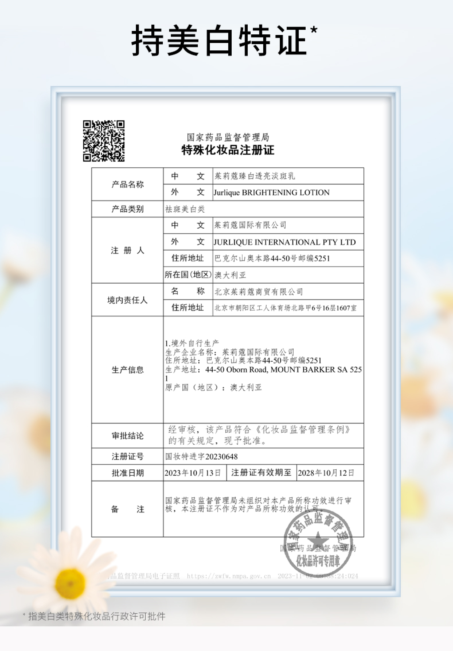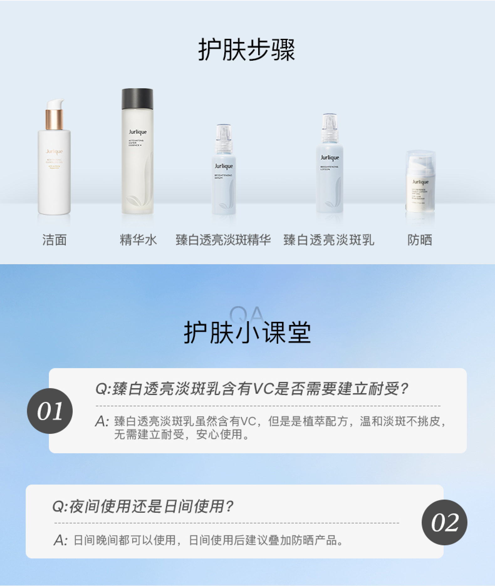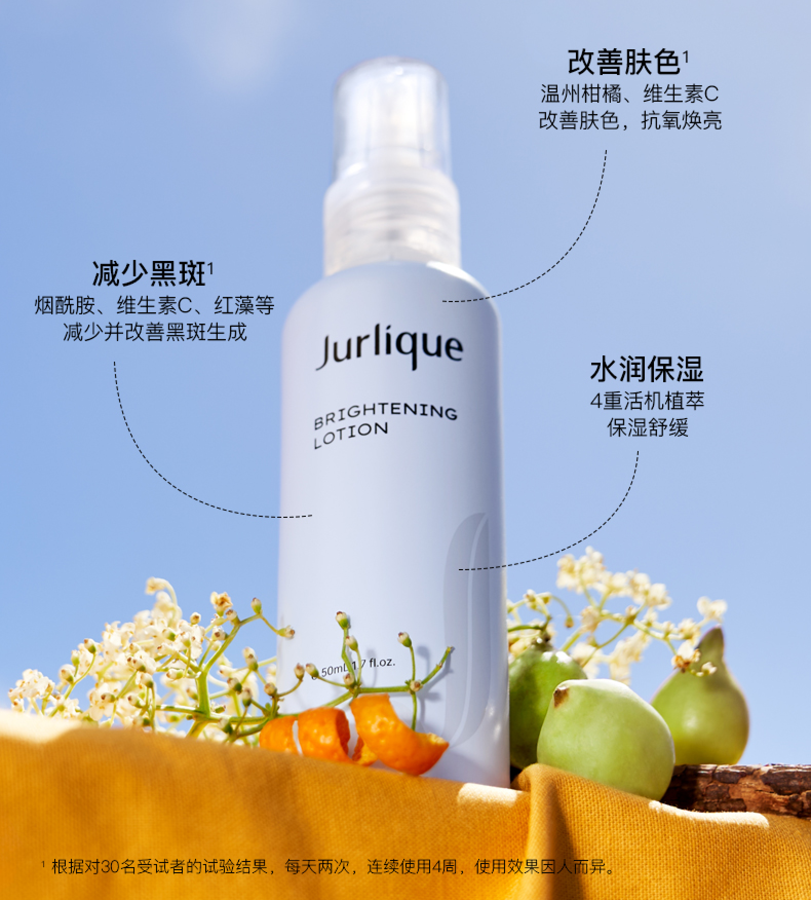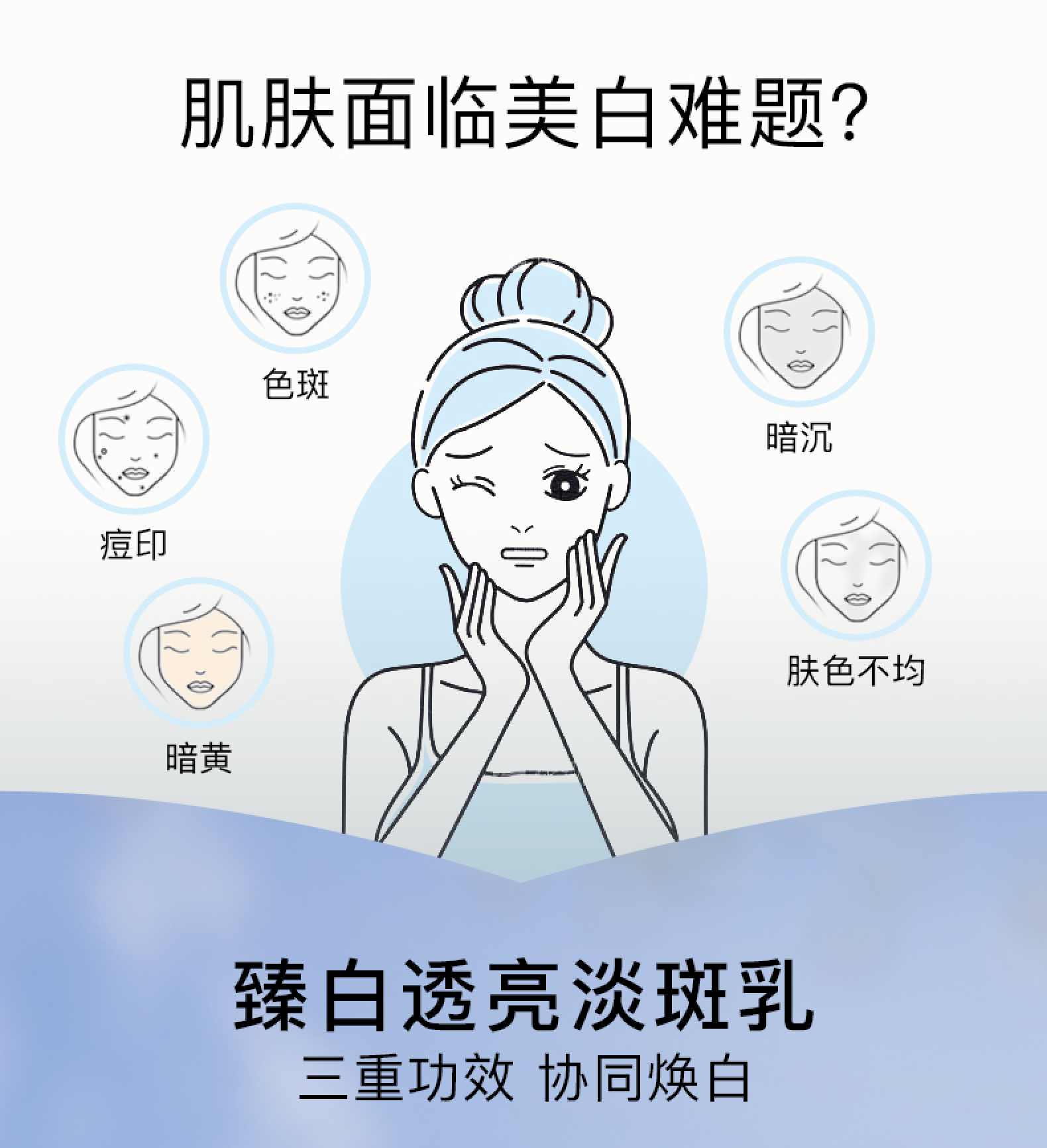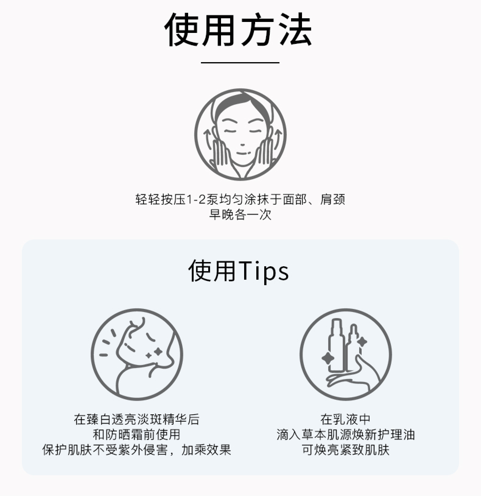 迅速保湿肌肤,肤感滋润舒适 稳步焕白,透亮淡斑* 塑造无暇透亮,净白滋润肌肤状态 *根据对30名受试者试验结果,每天两次,连续使用4周,使用效果因人而异。