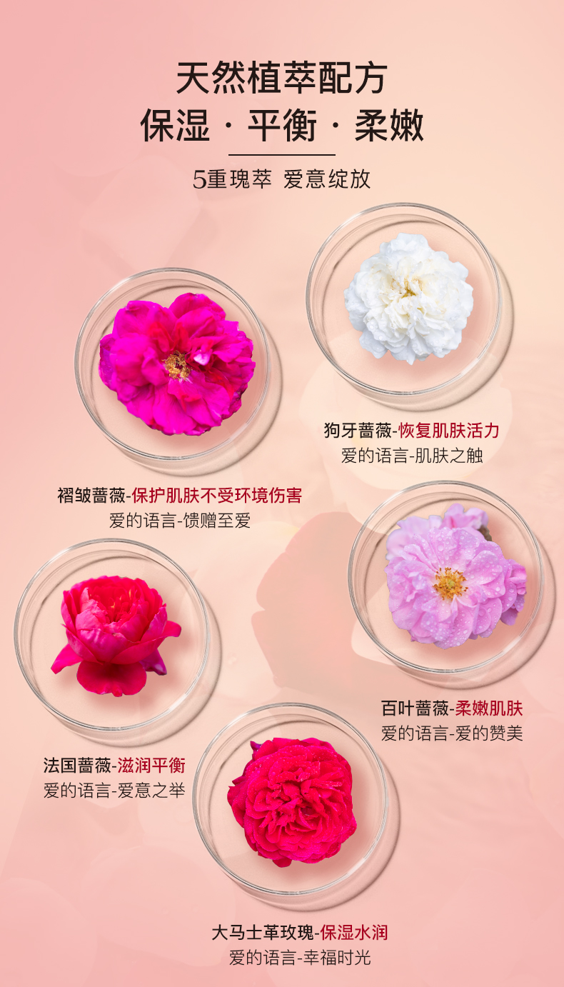 5重玫瑰精萃:补水沁润、软化皮肤、抗氧化