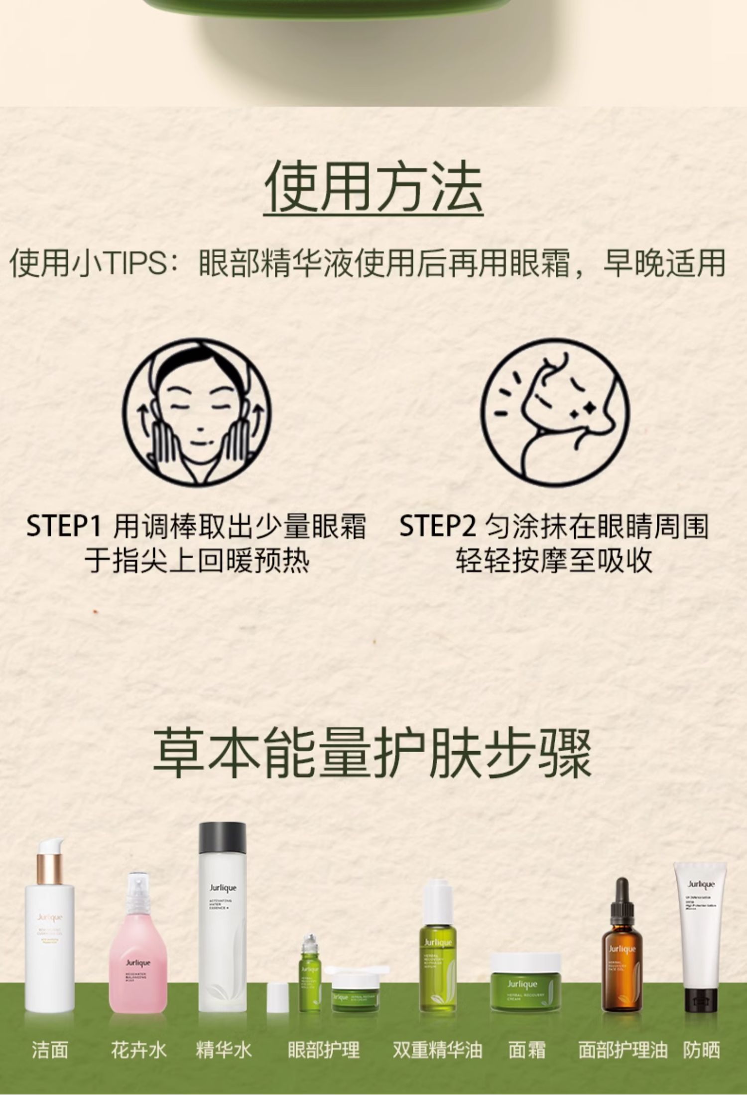用挑棒取出2粒米粒大小的眼霜 于指尖上回暖预热后 均匀涂抹在眼睛周围 轻轻按摩至吸收即可 早晚均可使用