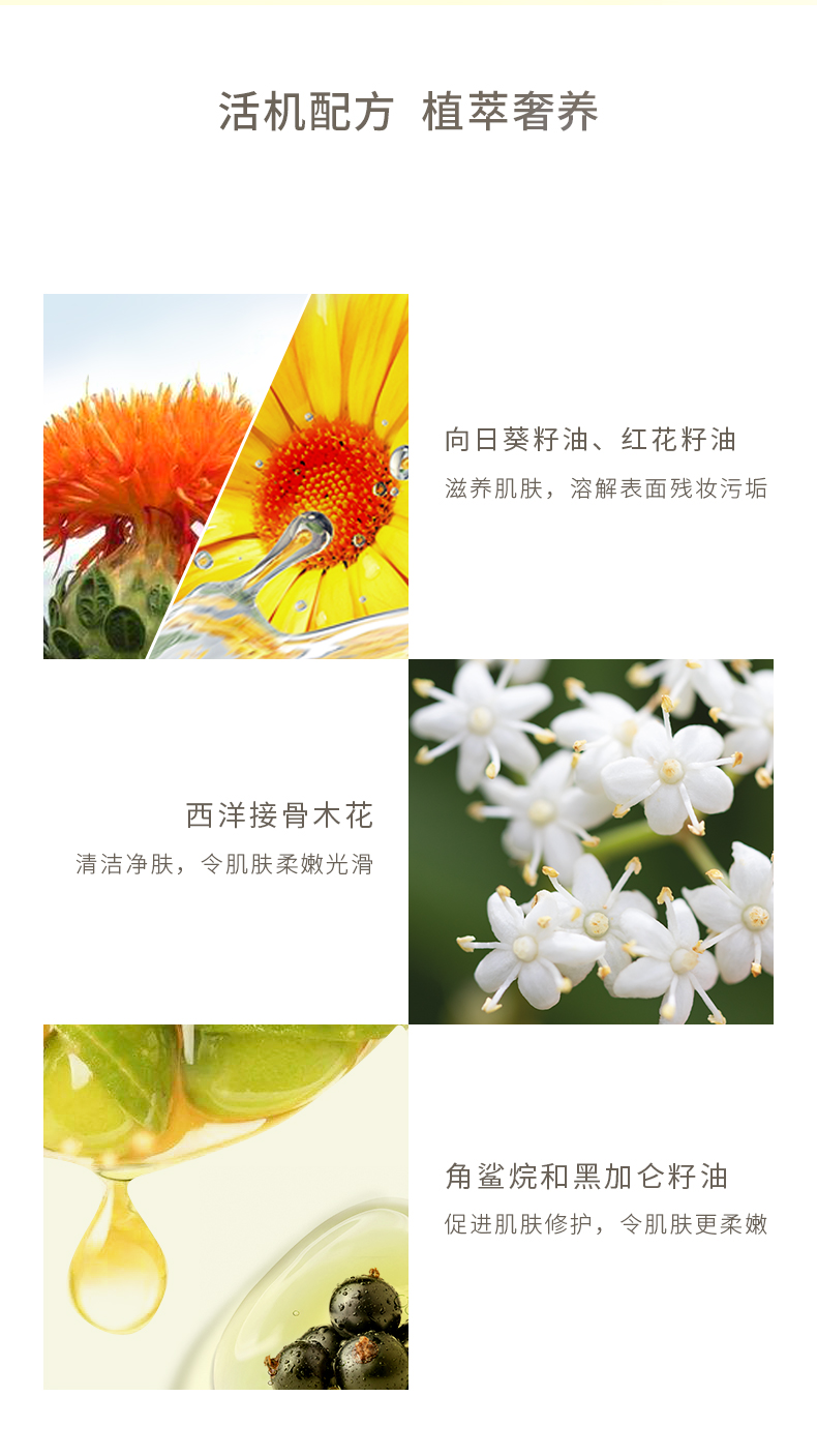 蕴含天然植物精华油和西洋接骨木花精粹 强有力清除底妆/彩妆等防水性污垢 遇水瞬间乳化,高效保湿,改善肌肤暗沉
