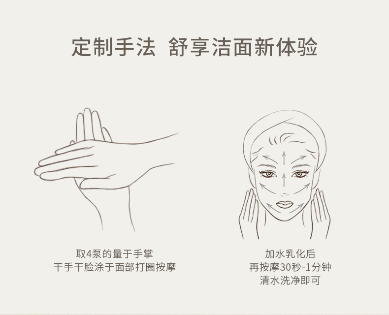 取4泵于手掌,干手干脸涂于面部打圈按摩