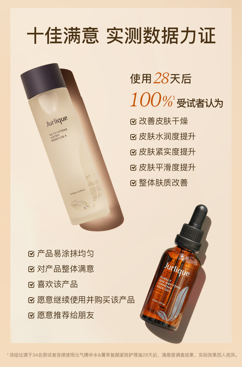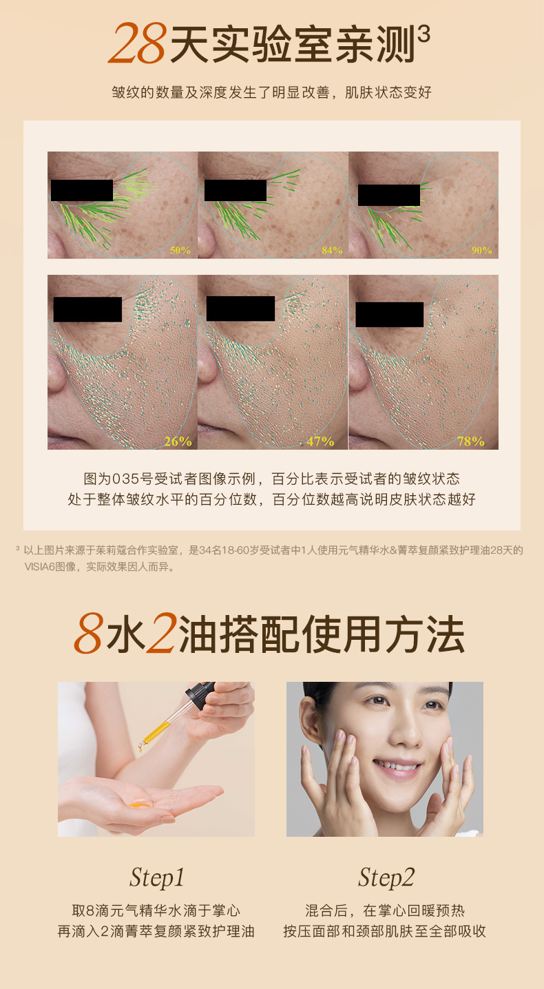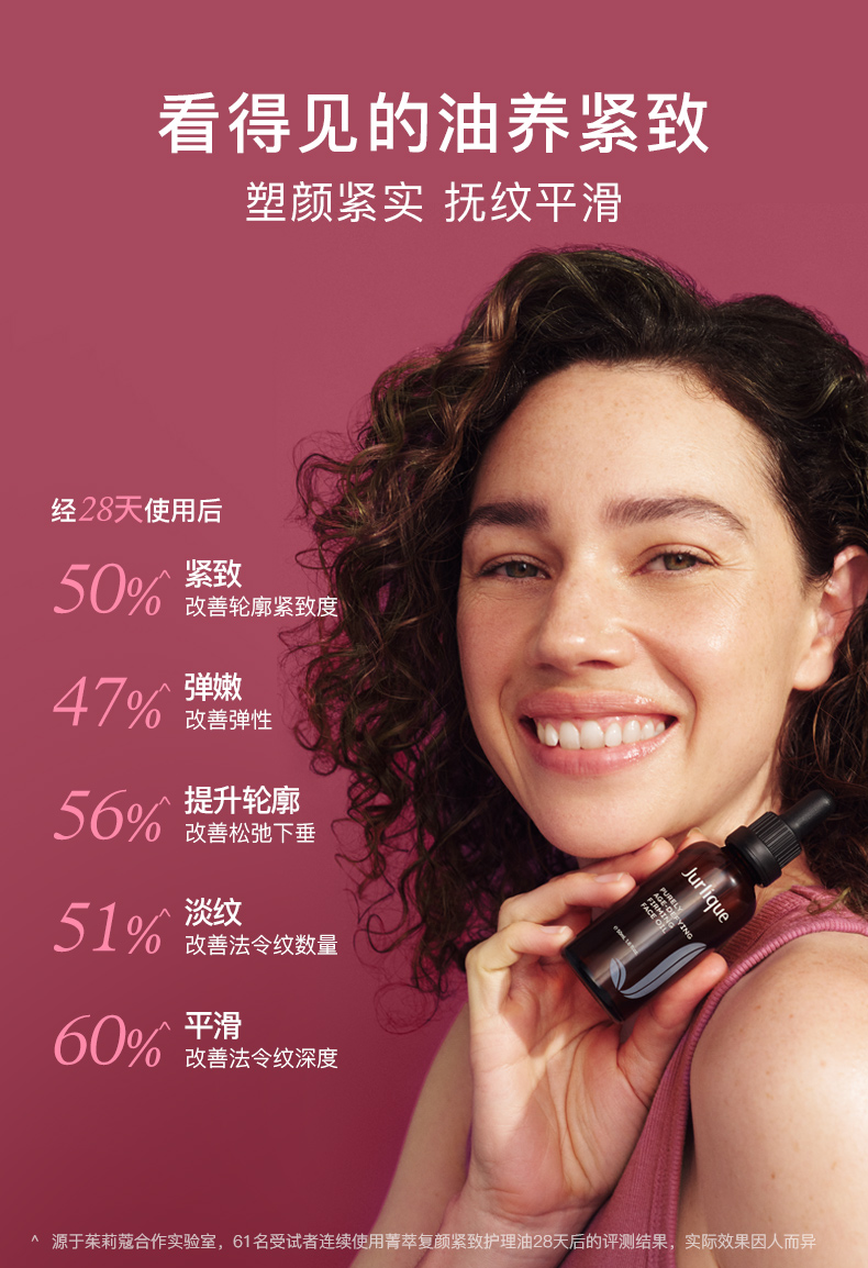 ^源于茱莉蔻合作实验室,61位受试者连续使用菁萃复颜紧致护理油28天后的评测结果,实际效果因人而异。