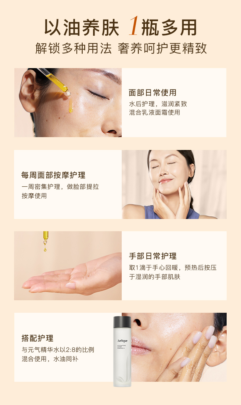 面部日常使用:水后护理,滋养紧致,混合乳液面霜使用。