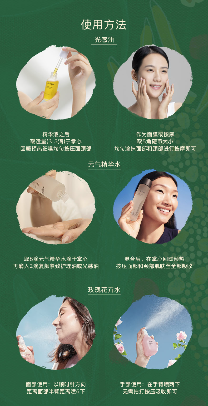 茱莉蔻光感油 超临界萃取独家玫瑰,释放长效保湿力 协同5种天然植萃油+植物角鲨烷 以油养肤,肌肤透现柔润光采 元气精华水 维稳打开肌肤吸收通路,强韧肌底屏障 玫瑰花卉水 均匀在面部给冬季干燥的肌肤注入水嫩活力