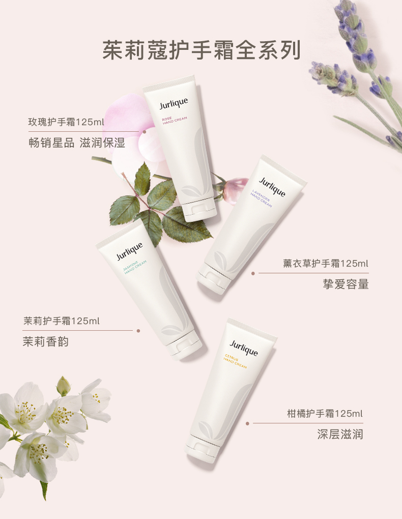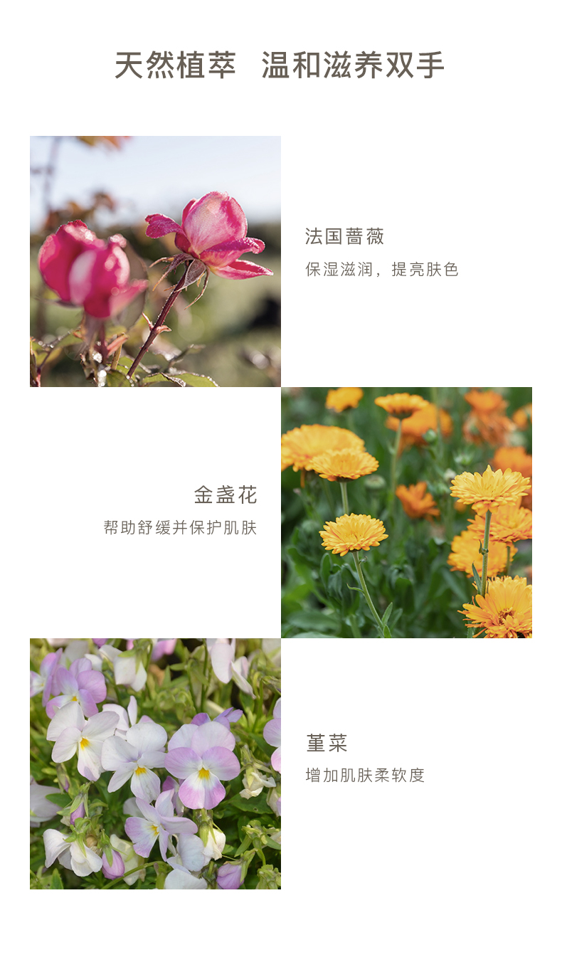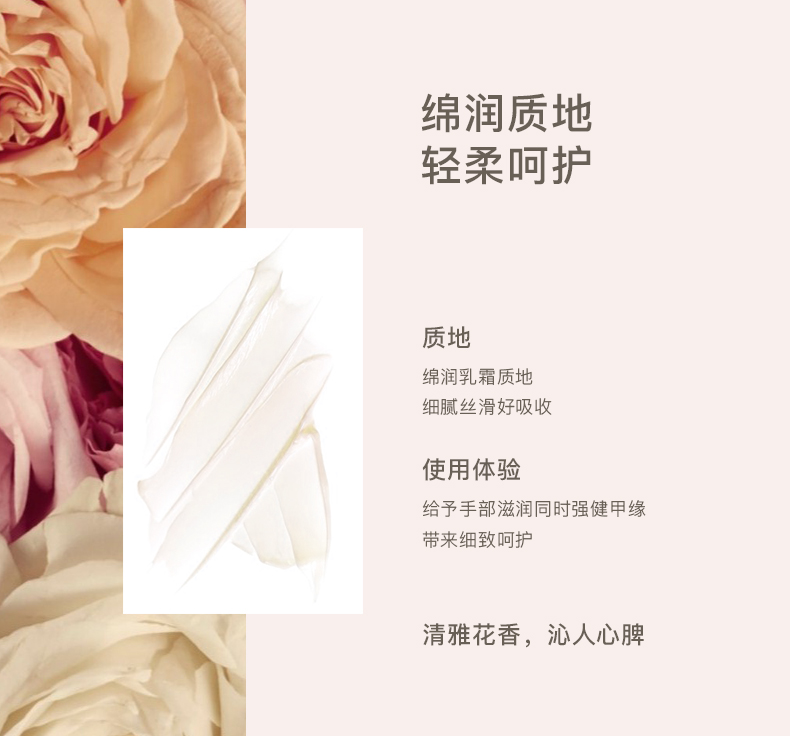 沁润滋养双手 感受愉悦芬芳 蕴含多种柔肤植物力量 带给双手深层滋润及保护 质地丰盈柔滑迅速吸收