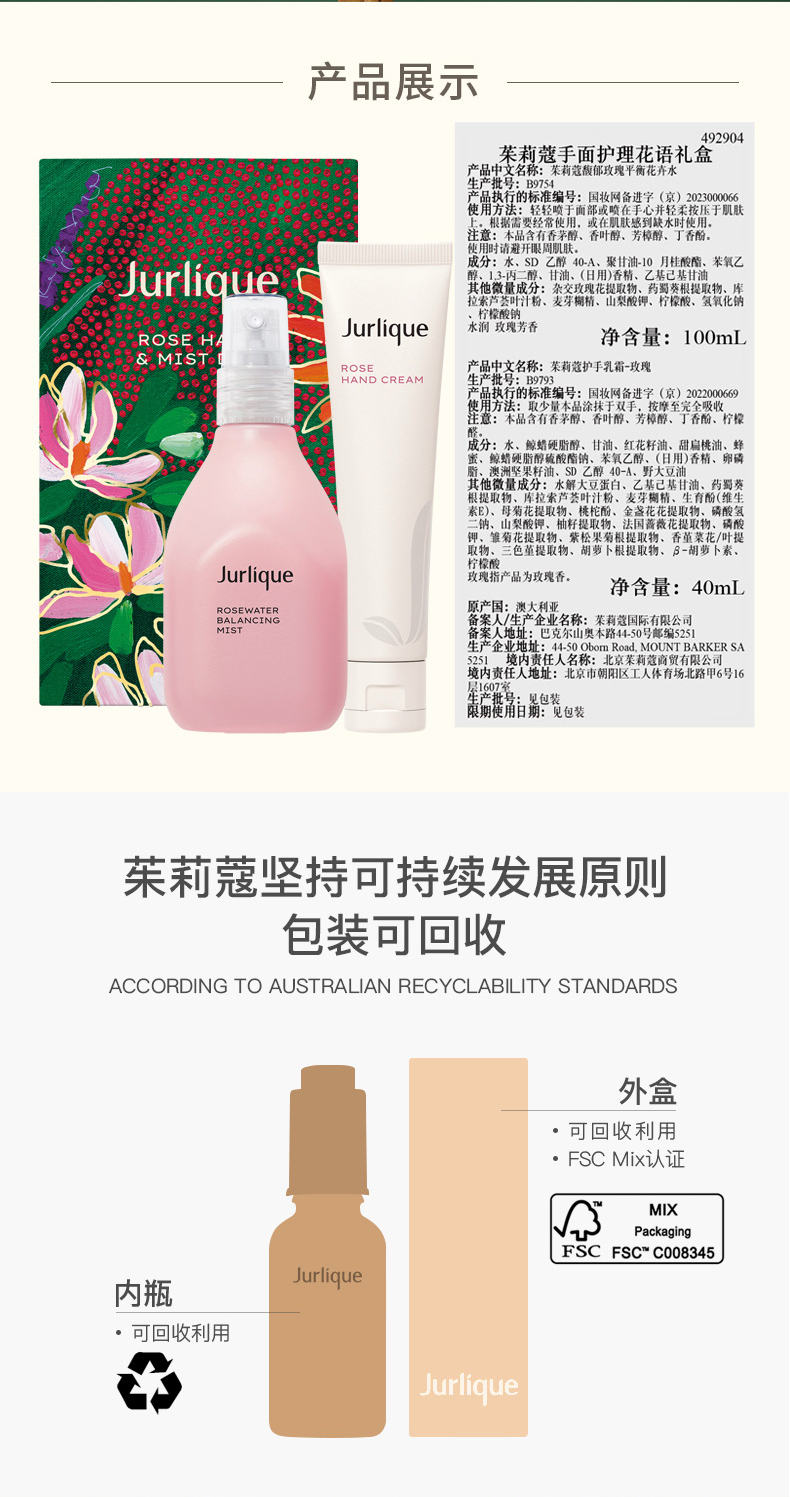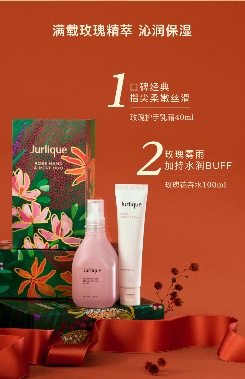 套装包含: 茱莉蔻馥郁玫瑰平衡花卉水 50mL 茱莉蔻护手乳霜-玫瑰 40mL