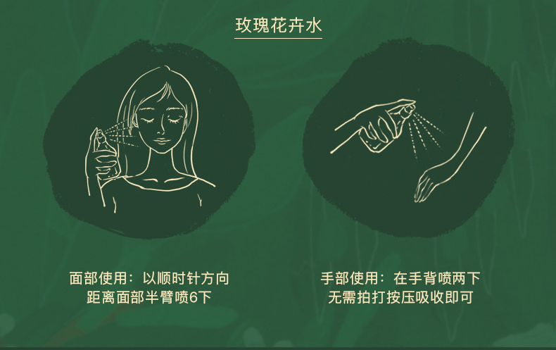 洁面后,喷洒于面部,轻轻按压帮助吸收; 取适量乳霜在手上,按摩直到充分吸收。
