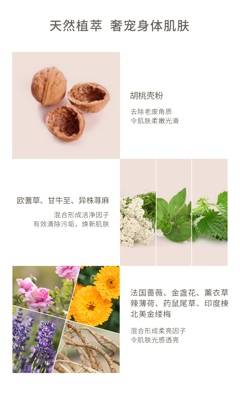 胡桃壳粉; 清除角质,嫩滑肌肤