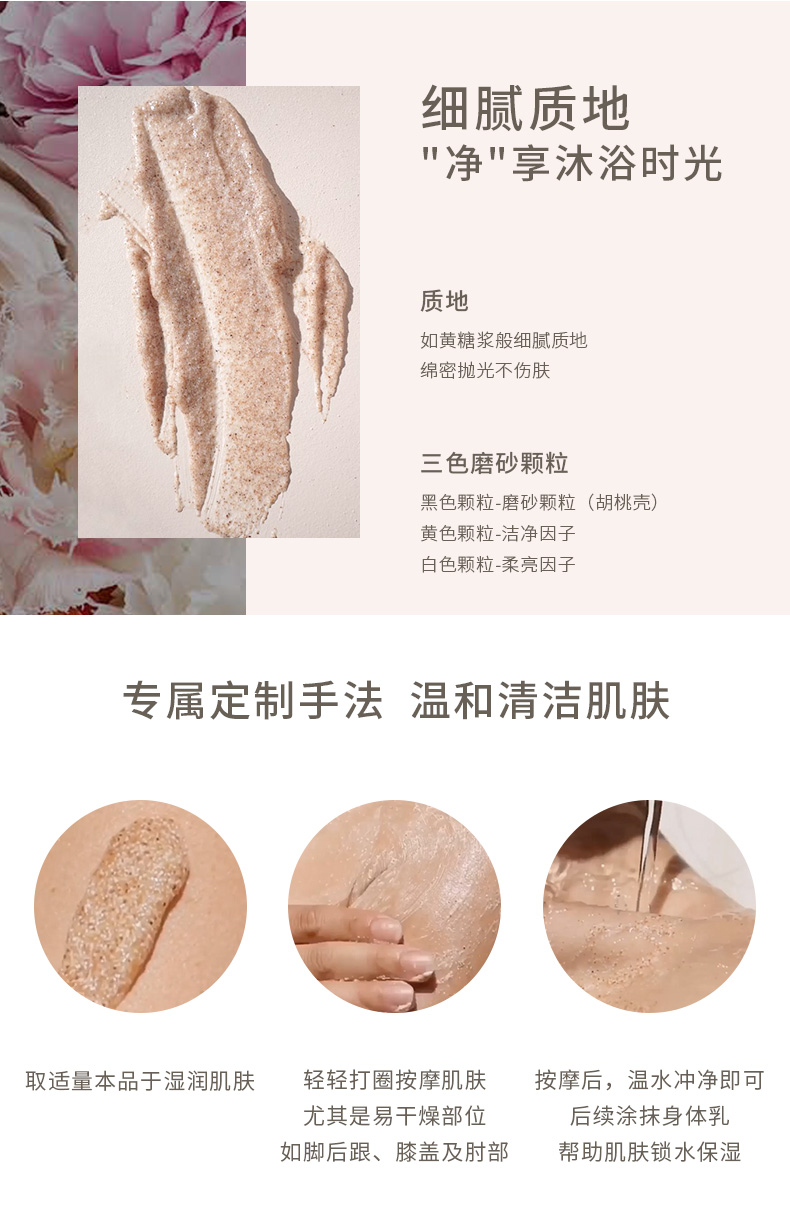 取适量磨砂凝露涂在湿润的皮肤上,轻轻打圈均匀延展开。轻柔按摩涂抹凝露的部位,藉由体温使凝露融化起泡。适当加水使泡沫足够丰盈,画圈按摩5分钟后冲洗。对于四肢关节、后背等角质粗厚处,可多按摩2至3分钟再冲洗,肌肤将更感光滑滋润。